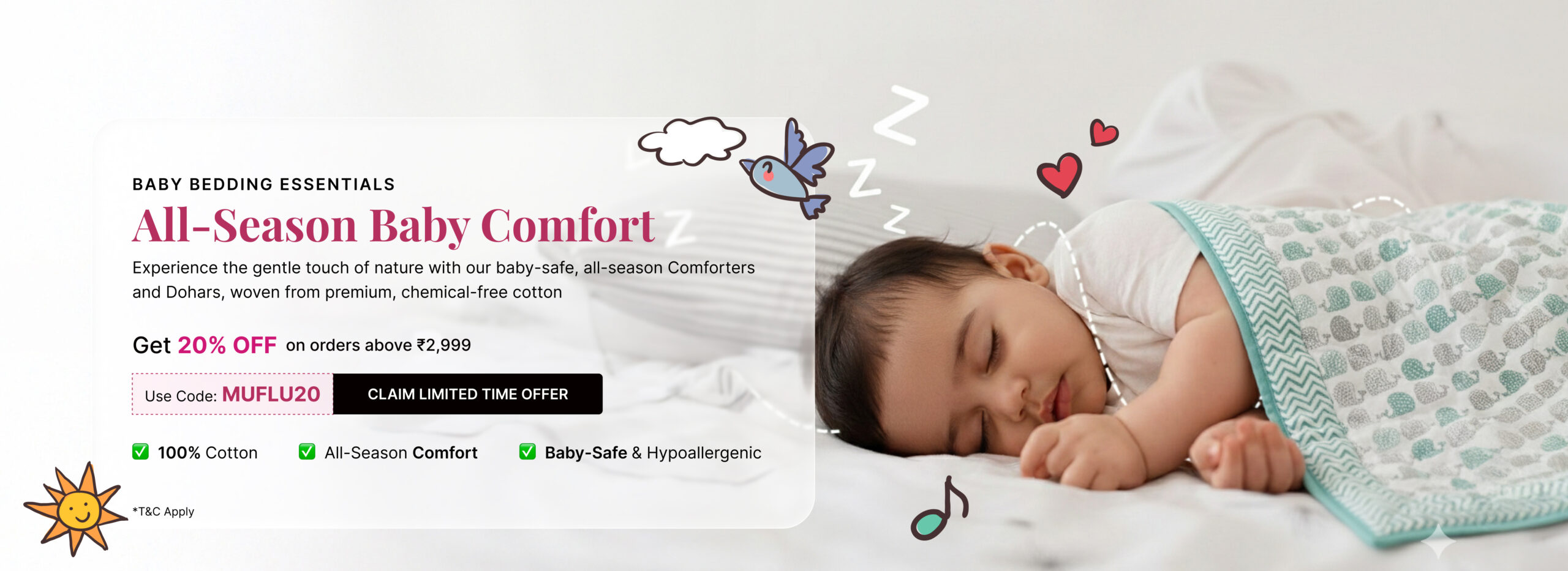 Handcrafted with precision and love, each comforter goes through rigorous quality checks to ensure it’s as perfect as your little one. Our artisans, many of whom are mothers themselves, put heart into every stitch — so your baby sleeps in more than just fabric.