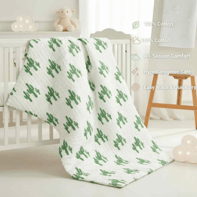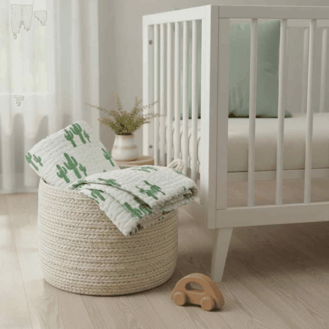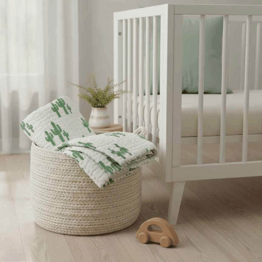 Our Green Cactus Kantha Baby Comforter brings a fresh, modern touch to your nursery with its minimal green cactus print and soft kantha-style stitching. The playful yet clean design makes it perfect for both boys and gender-neutral themes.