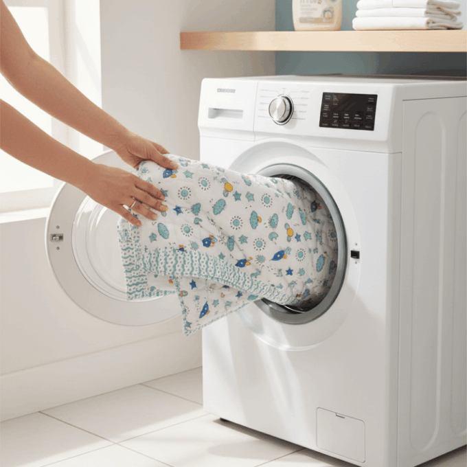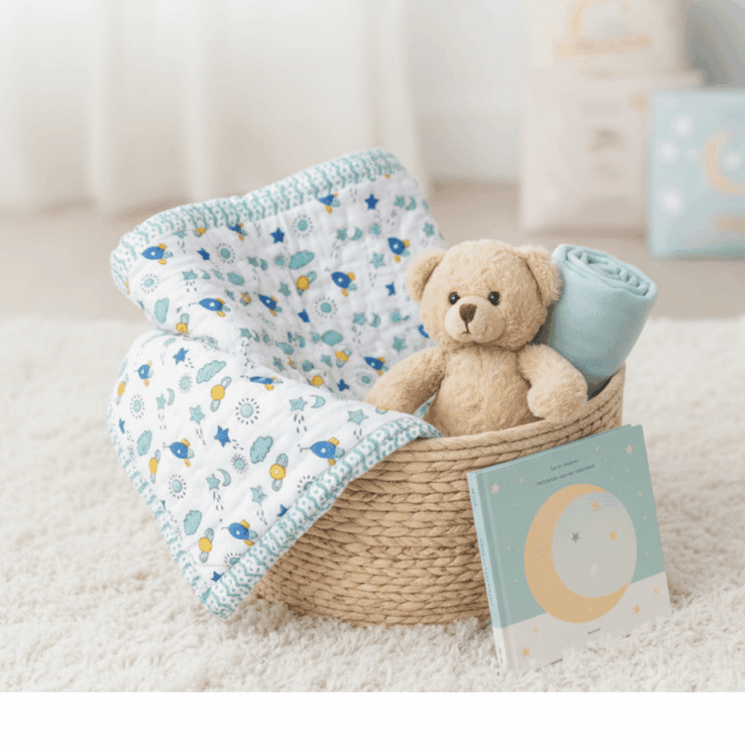 Let your baby drift into dreamy naps with our Space Rockets Handblock Baby Comforter. Featuring rockets, stars, clouds, sun and moon motifs, this playful space-themed comforter sparks imagination while keeping your little one wrapped in all-season comfort. Handcrafted with pure cotton, it’s gentle on delicate skin and made for everyday cuddles.